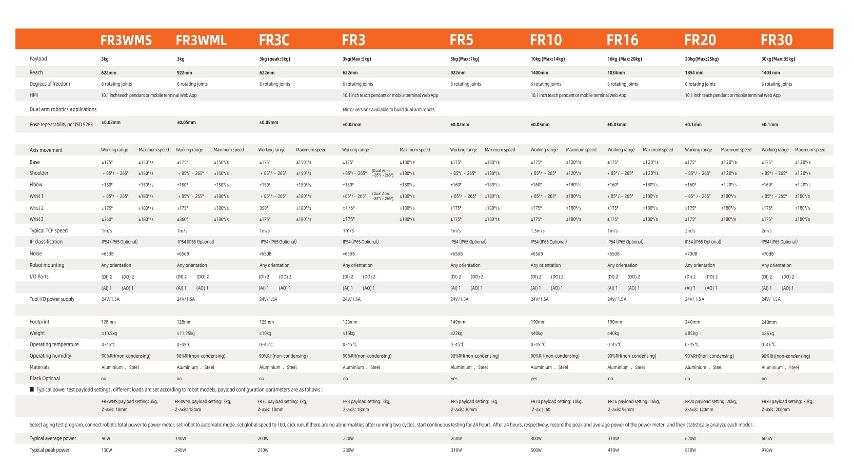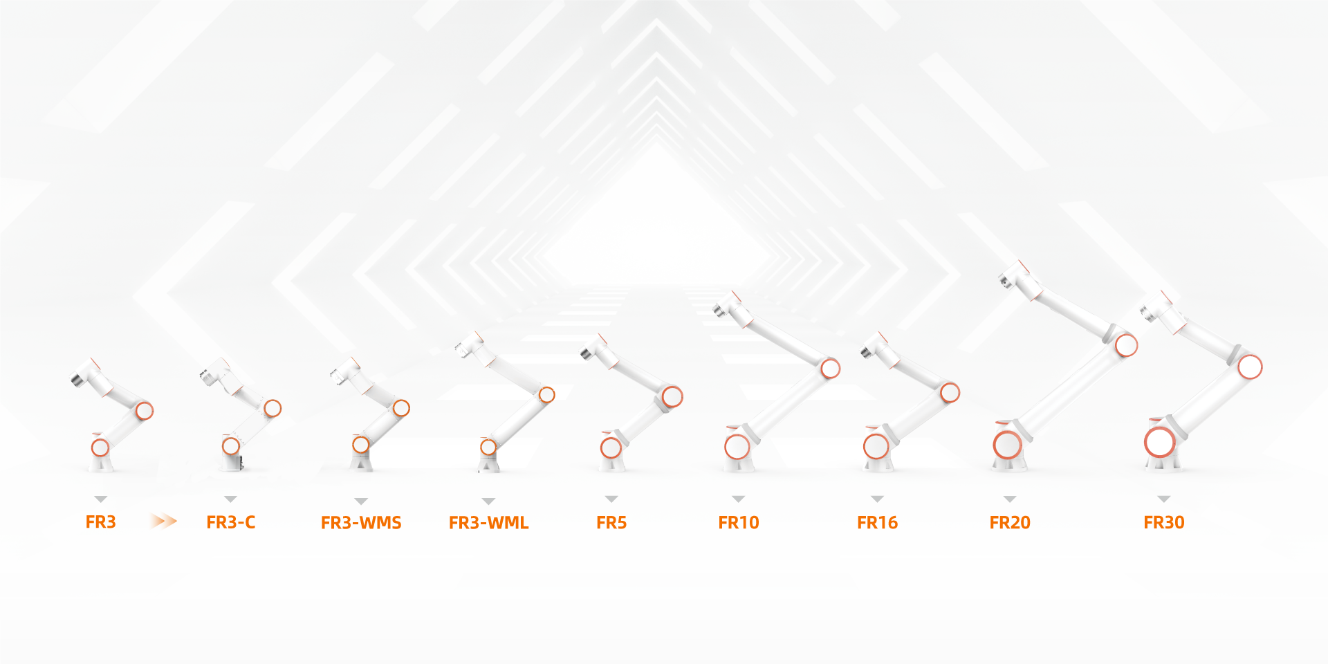 According to different payload and parameter, FAIRINO collaborative robots FR series are divided into six models: FR3, FR5, FR10, FR16, FR20 and FR30.